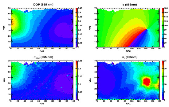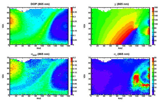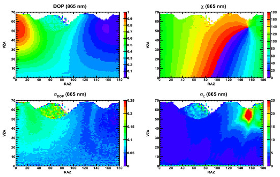 Since the CLARREO Pathfinder instrument is not designed to measure polarization parameters, in order to meet the stringent intercalibration uncertainty requirements, one must use polarization lookup tables. These tables are derived from the Polarization Distribution Models (PDMs). Following the scheme proposed in [8], an individual PDM is simply a two-dimensional distribution of P or in RAZ and VZA, with the rest of the parameters either fixed or constrained. Two types of PDMs will be used by the Pathfinder mission: the empirical and theoretical. The former are based on the polarization measurements obtained by the POLDER instrument [11], while the latter on the results from the Adding-Doubling Radiative Transfer Model (ADRTM) [12]. The POLDER instrument was mounted onboard the PARASOL satellite, active between 2004 and 2013. POLDER’s Charge-Coupled Device (CCD) detector took measurements from nine spectral channels from blue (443 nm) to infrared (1020 nm), three of which—490, 670, and 865 nm—were polarized. The results discussed in this article rely on the Stokes parameters measured by the 865-nm channel. The empirical PDMs shown here represent global averages and standard deviations (used to estimate the contribution of polarization to the uncertainty in reflectance) of P and as a function of RAZ and VZA, using the 2006 polarization data obtained by POLDER. For further details on the PDM construction, see [8,13]).
