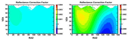 While the clear-sky ocean ocean scene yields one of the lowest obtainable reflectances, it is characterized, at the same time, by some of the highest polarization values among the surface types identified by the International Geosphere-Biosphere Programme (IGBP) [17]. In this example, the chosen VIIRS band was M7, corresponding to the central wavelength of 862 nm, lying within the bandwidth of 33.7 nm [18] of the corresponding POLDER band of 865 nm. The latter band was used to construct the empirical P and PDMs (Figure 2, top). In order to demonstrate the magnitude and the spread of values of the correction factor , we took the lowest and the highest values of the VIIRS diattenuation coefficient measured in the lab settings for a given wavelength. The lowest diattenuation coefficient was found for Detector 4, with Half-Angle Mirror (HAM) Side A and at scan angle , while the highest, , for Detector 10, HAM Side B, scan angle . (Several configurations of the detector, HAM, and scan angle yielded approximately equal lowest and highest diattenuation coefficients, but for simplicity, we picked only one high and low value). The corresponding values of the phase angle were measured to be and , respectively. Using these values and the PDMs plotted in Figure 2, to compute the correction factor c (Equation (6)), we obtained the plots in Figure 3. We observe that the correction factor was, essentially, one for , and for , it varied between 0.999 and 1.003, depending on RAZ and VZA.