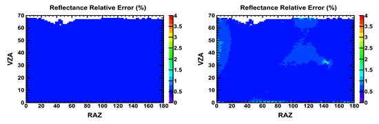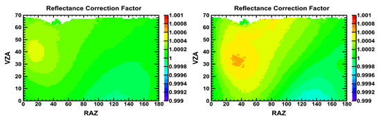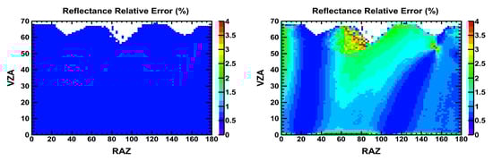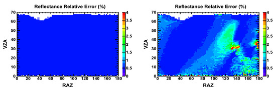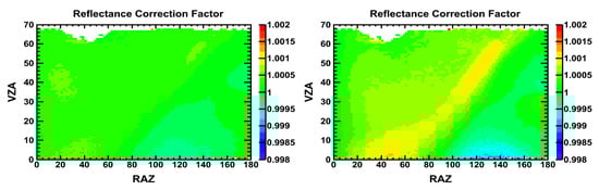 Similar to the case of computing the correction coefficient, we would like to find the magnitude and the spread of values in RAZ and VZA for the polarization contribution to the uncertainty in reflectance (Equation (13)) for a given wavelength. To this end, we, once again, took the same lowest and highest VIIRS values for as described in the previous paragraph and combined them with the lowest and highest targeted limits on the CPF diattenuation, and , respectively. In the absence of the physical CPF instrument in both cases, we assumed (our studies show that varying the phase angle does not change the average value of c and , but rather, shifted the maximum around the RAZ/VZA phase space). The resulting is plotted in Figure 4. The left-hand panel corresponds to the lower bound in , i.e., , , and , while the right panel, to the upper bound, i.e., , , and . Propagating the error, as in Equation (13), we found that for , the uncertainty in reflectance due to polarization was approximately constant at 0.44%, while for , it varied between 0.44% and 4%, with the average uncertainty of 1.2%, as a function of RAZ and VZA.
