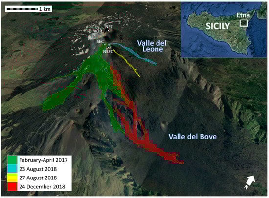 After the 2008–2009 flank eruption [], the volcanic activity of Etna has shown a more explosive behavior, with an increasing number of paroxysmal events at the summit craters [,]. Indeed, 57 eruptive episodes occurred from 2011 to 2018, most of them characterized by the emission of lava fountains, pyroclastic material, and short-lasting lava flows []. A 2013 analysis of lava flow hazards and their distribution around the Etna volcano showed them to be far more dangerous than previously expected []. Here, we investigate the three most recent eruptive episodes occurring at Etna in February–April 2017, August 2018 and December 2018, which were characterized by lava emission forming extensive lava flow fields (Figure 1).