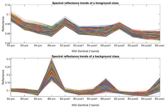 Difference between background (BG) and foreground (FG) pixels spectral reflectance trends over pre- and post- MSI Sentinel-2 data. Trends of pixels belonging to a FG class (up) and trends of the pixels belonging to a BG class (down) are shown. Different colored lines correspond to the pixels belonging to the FG class (up) and BG class (down).