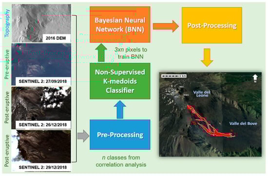 Here, we present a novel classifier based on machine learning techniques designed to classify pixels related to recent lava flows from pre- and post-eruptive multispectral images combined with pre-eruptive digital topography. We utilized the Multispectral Imager (MSI) onboard Sentinel-2 satellite and the high-resolution topographic data derived from tri-stereo Pléiades-1 satellite imagery. A k-medoids unsupervised clustering is used as a strategy to minimize the ANN training dataset size. The proposed ANN is trained by using the “Bayesian regularization” training function [], thus the ANN will be referred to as BNN (i.e., Bayesian Neural Network). In particular, a small number of points belonging to the cooled lava flow are used to feed the BNN and obtain a 2D map. This approach is semi-automatic and was applied as a support instrument to map active lava flows of several recent effusive eruptions at Mount Etna.