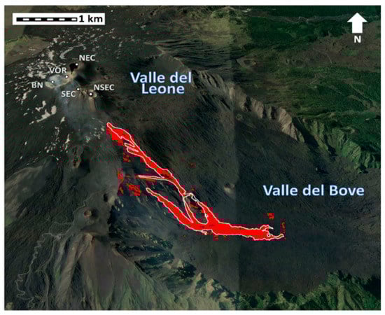 Mt Etna is one of the most active volcanoes in the world, showing a quasi-continuous activity at the summit craters and frequent events along fissures on its flanks [,]. Both summit and flank eruptions are likely to produce lava flows, and these present a major hazard to communities living and working in close proximity to the volcano []. Among the several lava flows produced by Mt Etna since the year 2000, the most damaging ones occurred in 2001 and 2002–2003. Lava flows extensively devastated tourist facilities, which are located at high altitudes on the southern and northern flanks of the volcano, with serious damage to the local economy []. The following flank eruptions occurred in 2004, 2006 and 2008–2009 from fissures opened at the eastern base of the Southeast Crater, one of the summit craters of Etna volcano. Fortunately, all these lava flow fields developed in the uninhabited Valle del Bove, a wide depression cutting the eastern flank of Mount Etna. It is worth to note that the 2008–2009 eruption was the longest flank eruption after the large 1991–1993 event and the second longest since the seventeenth century [].