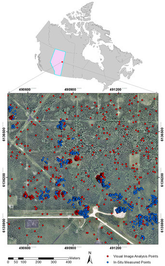Study area location in Alberta, Canada. Human disturbances related to petroleum extraction—roads, seismic lines (petroleum exploration corridors), and exploration wells—are easily distinguishable from the underlying undisturbed forest. The in-situ reference points are displayed using blue circles and image analysis-based reference points are displayed using red circles.
