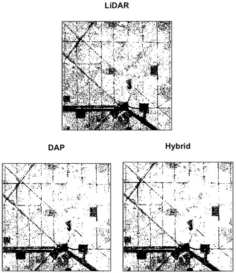 Figure 5 presents the three derived maps delineating canopy openings and no-openings from DSMLiDAR, DSMDAP, and DSMHybrid. Substantial differences between the LiDAR and DAP/hybridyHyH maps are apparent, especially in terms of number of openings and the total area classified as opening. However, there is very little visible difference between DAP and hybrid.