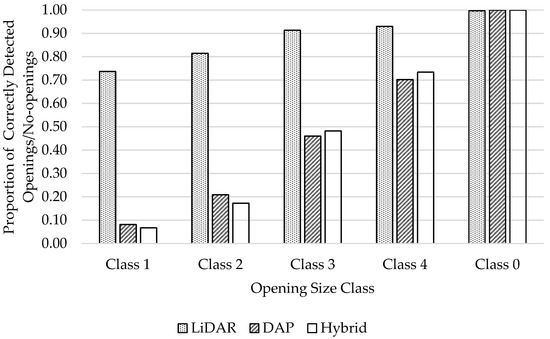 Figure 6 presents relative-detection accuracies within different opening-size classes. Accuracies were observed to rise for all three data sets as opening-size class increased. No-openings (Class 0) were detected at close to 100% by all three approaches. LiDAR-detection results were notably higher than those produced by DAP and hybrid data sets for all four classes of openings. While DAP and hybrid CHMs were found to be reasonably able to detect openings larger than 200 m2 (Class 4; >70%), small openings <20 m2 had very low (<20%) detection rates. LiDAR, on the other hand, showed detection rates >70% for all size classes and >90% for openings larger than 20 m2 (Classes 3 and 4). On an average, overall opening detection accuracy of LiDAR, DAP and hybrid models were 87%, 46%, and 47% respectively (excluding no-opening samples).