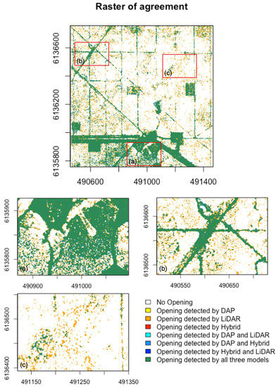Raster of agreement for all three opening detection approaches, presented for the entire study area (a) and two excerpts, showing detailed distributions of agreement (b) and (c). The legend shows the number and kind of opening maps agreeing on the classification of a pixel as opening. Pixels with the value “0” are not classified as opening by any approach.