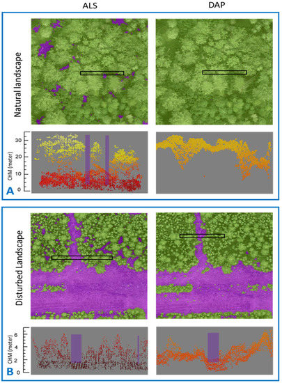 A visual comparison between LiDAR and DAP opening map segments in the study area. In the map segments, the purple areas represent pixels classified as opening by the respective approach, whereas the trees visibility is enhanced by using a green overlay. Black rectangles in each map segments represent an area for which corresponding vertical profiles of original elevation data (point cloud) are displayed below. Figure 6A displays a sample area in natural landscape where small openings are picked up by LiDAR (left) but not by DAP (right). Figure 6B represents a sample area in disturbed landscape where roads and seismic lines are more or less perfectly detected by both techniques. However, the LiDAR data identify other smaller openings in the surrounding landscape that DAP does not identify.