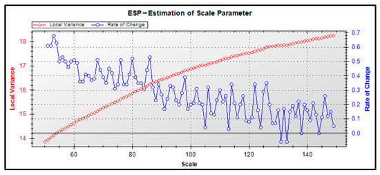The experiment began with a determination of the segmentation scale, in the image, each segmented object corresponded to the actual feature as much as possible. Specific object types could be expressed by one or several objects. The shape of the object boundary should not be overly broken, the spectral differences of objects in the same class should be small, and the boundaries of features should not be blurred [51]. Image segmentation and subsequent selection of experimental features, classification, and assessment of accuracy were completed in eCognition. Several key parameters were set during multi-scale segmentation, including shape, compactness, and scale. The sum of shape and color is 1, with shape determining the proportion of image spectral (color) information and object shape information in the segmentation process. If the shape is 0.3, for example, then color is 0.7. The sum of smoothness and compactness is also 1, with compactness controlling how much the object’s shape tends to be spatially compact versus spectrally homogeneous (smooth) but less compact. The scale parameter limits the color and shape complexity of the overall object [52]. ESP [53], a tool proposed by Dragut for automatically obtaining the optimal segmentation scale parameters for the multi-scale segmentation algorithm in eCognition, was used as a scale evaluation tool for this experiment. The optimal segmentation scale parameters were determined from the evaluation results of ESP tools, visual discrimination of the segmentation effect, and the actual situation of surface features. The results of the ESP calculation were obtained, and three representative peaks, 126, 86, and 53, were selected for segmentation experiments (Figure 3).