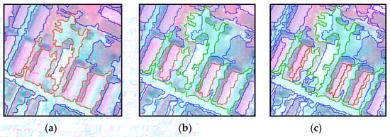 The segmentation effect at different scales. (a) Shape 0.2, compactness 0.5, and segmentation scale 126; (b) shape 0.2, compactness 0.5, and segmentation scale 86; and (c) shape 0.2, compactness 0.5, and segmentation scale 53.