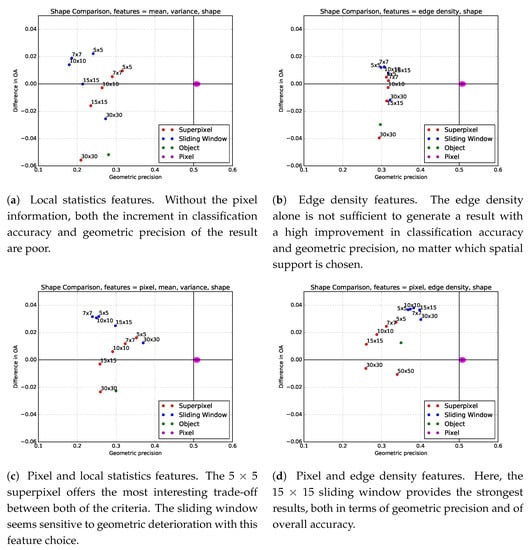 Figure 14c,d show the result of the classification when including respectively local statistics, and edge density features, in a sliding window neighborhood of size 11 × 11. Visually, it appears that the amount of noise is reduced, compared to the pixel-based classification result. However, in the case of the local statistics features, some of the corners seem quite rounded, and fine elements like the river are deformed, and at some places even lost. Using a structured texture feature like edge density, this effect is largely reduced. On the other hand, round-shaped artifacts appear in the urban area, due to the isotropic nature of the square neighborhood. Figure 15 confirms several of these conclusions. In particular, Figure 15c shows that the sliding window neighborhoods can provide an increase in classification accuracy, but at the cost of a deterioration of the geometric precision. Surprisingly, when the window size is very large (30 × 30), the geometric precision increases. To understand this it is necessary to analyze the Random Forest variable importance, as defined in []. It appears that when the window size is too large, the contextual information is mostly discarded by the classifier. This explains why when increasing the window size, the geometric precision increases, but the statistical accuracy decreases, because the classification gets closer to the pixel-based prediction. Furthermore, Figure 15a,b show that both the classification accuracy and geometric precision of the sliding window neighborhood result are quite low when the pixel information is not included. Finally, Figure 15d shows that using edge density features in combination with pixel features provides the best results, both in terms of classification accuracy and geometry.