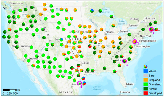 The overview of 150 study sites across the contiguous United States. Pie graphs indicate the land use pattern at each site. Purple circles indicate the four primary sites.