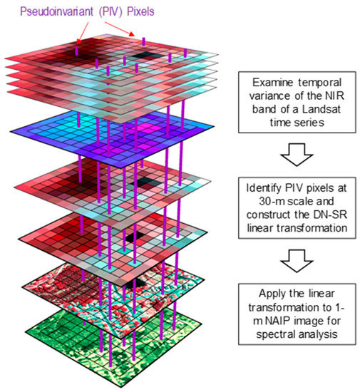 We propose a pseudoinvariant near-infrared threshold (PINT) method that can convert the digital numbers of NAIP imagery into surface reflectance based on PIV pixels identified from Landsat imagery (Figure 2). It assumes that a linear relationship exists between digital numbers from a 1 m NAIP image and surface reflectance from a 30 m Landsat image for overlapping areas, if the two images are acquired simultaneously and the atmospheric condition is homogenous within the scene. The Landsat surface reflectance image is considered as a proxy of actual ground-level reflectance measurements for PIV pixels, which follows a strategy that has been used for the correction and validation of satellite images with different resolutions [36,37]. Landsat has been used as a reference radiometer against which many other satellite payloads have their performance gauged against. The overall uncertainty of Landsat Tier-1 surface reflectance product is on the order of 6–10% around the world, depending on spectral channel, underlying atmospheric conditions and radiometric calibration characteristics [16,38]. The correlation between Landsat and MODIS surface reflectance products is high and the bias is mostly around 1% to 5% with the largest difference in the blue band [38].