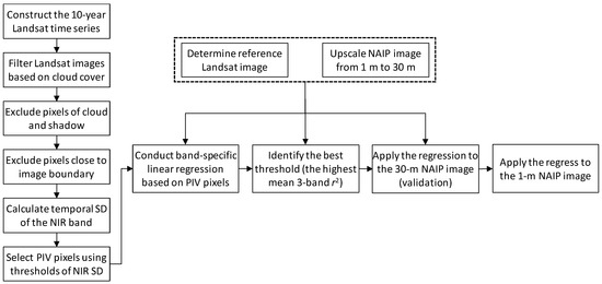 The procedure of PINT is centered on the identification of PIV pixels that can best define the linear transformation between surface reflectance and digital numbers, consisting of several steps, as shown in Figure 3. First, when the targeted NAIP image and the coincident Landsat image are determined, a ten year collection of Landsat TM and ETM+ images at this location is rigorously filtered. Images with cloud cover >50% in the scene were discarded. For the rest of the collection, pixels detected as clouds or shadows were masked out on each image. In the pixel quality band, the value of a pixel indicates the levels of confidence that a cloud and/or shadow condition exists at this pixel. Pixels with high cloud or shadow confidence were identified and masked out. Then, areas within 90 m (i.e., three Landsat pixels) of the edge of the targeted NAIP image were excluded to avoid the influence of boundary pixels. The temporal standard deviation of the near-infrared band at the pixel level is calculated over the ten years of Landsat images.
