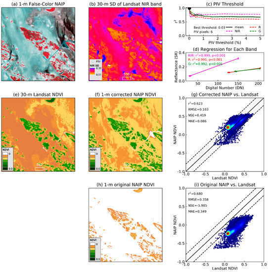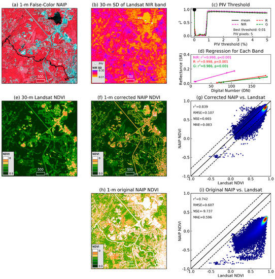 Application of PINT at site 4. Plots (a)–(d) demonstrate the identification of pseudoinvariant (PIV) pixels: plot (a) shows the 1 m false-color National Agriculture Imagery Program (NAIP) image (near-infrared (NIR), red and green bands) before radiometric correction; plot (b) shows pseudoinvariant features (white squares) identified from the 10 year NIR standard deviation of Landsat TM and ETM+ images; plot (c) demonstrates the identification of the best threshold (0.01st percentile); and plot (d) shows the linear regressions of Landsat surface reflectance and NAIP digital numbers based on pseudoinvariant pixels. Plots (e)–(i) show the validation of the normalized difference vegetation index (NDVI) values: plot (e) shows 30 m Landsat NDVI as the reference; plots (f) and (h) show 1 m NAIP NDVI before and after correction, respectively; and plots (g) and (i) show the agreement with Landsat reference before and after correction, respectively. The solid line is the 1:1 line, indicating a perfect match between NAIP and Landsat NDVI values, and the dashed lines represent the upper and lower 10% error bounds.