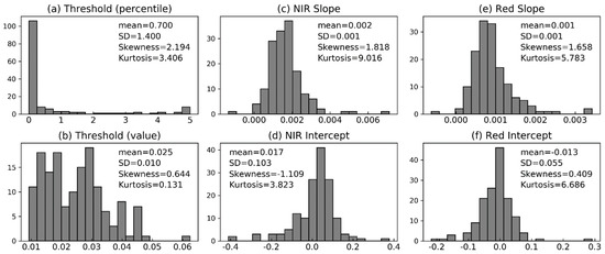 Identification of PIV pixels for 150 sites. Plots (a) and (b) show percentiles and values of identified near-infrared thresholds. Plots (c) and (d) show slopes and intercepts of linear regression models for the near-infrared band. Plots (e) and (f) show slopes and intercepts of linear regression models for the red band.