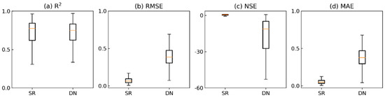 Results of NDVI validation for 150 sites: (a) coefficient of determination, (b) root mean square error, (c) Nash–Sutcliffe efficiency, and (d) mean absolute error.