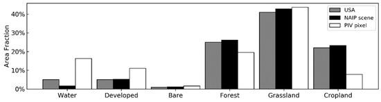 PIV pixels are taken as approximations of features with spectral properties that do not change significantly over time [15]. Land cover has been used as a key characteristic for the identification and description of PIV pixels. The results of this study provide a comprehensive viewpoint to examine the link between land cover and PIV pixels. On the basis of the 2011 National Land Cover Database (NCLD), Figure 10 shows the average land use conditions for the 150 NAIP images and the PIV pixels identified in them, with a comparison to the land cover of the contiguous United States. The sixteen NCLD land cover classes were grouped into the following six general categories: water, developed, barren land, forest, grassland, and cropland. As the NAIP images were selected using a stratified sampling approach, the pattern of their land cover effectively represented the national land cover pattern in 2011. The grassland category consisted of various types of shrublands, grasslands, and herbaceous wetlands. It was the dominant land cover category across the NAIP images (43%) and the identified PIV pixels (44%). Forest accounted for 26% in the NAIP images, but only 20% of the PIV pixels. Similarly, cropland accounted for 23% in the images, but merely 8% of the PIV pixels. This indicates that the phenological variations of forest and crop species are more detectable than that of natural herbaceous plants in the Landsat NIR band. Water and developed areas together contributed to 27% of the PIV pixels, a more influential role as compared to the small fractions of scenes (7% for both) occupied by them. This is consistent with the common uses of various man-made structures and clear deep waterbodies as PIV features in previous studies [21,41,42]. Nevertheless, the results of this study show that on the average over 70% PIV pixels were derived from vegetated areas. PIV pixels might be identified in some vegetation areas where the fractional vegetation coverage is low and phenological changes are less significant as compared with fully-vegetated areas (Figure S2 in Supplementary Materials). This suggests that PIV-based relative radiometric correction approaches are suitable for a variety of regions and are not limited to urban areas. Comparisons between the 1 m NDVI images and the 30 m reference Landsat images at the primary sites (Figure 4, Figure 5, Figure 6 and Figure 7) also indicate that a PIV pixel may not be occupied by a homogenous land cover. This provides evidence to support the finding by Padró et al. (2017) [37] that a PIV feature can be spectrally heterogeneous while it is radiometrically stable, i.e., its global reflectance does not change over time even if there are different land covers inside the area.