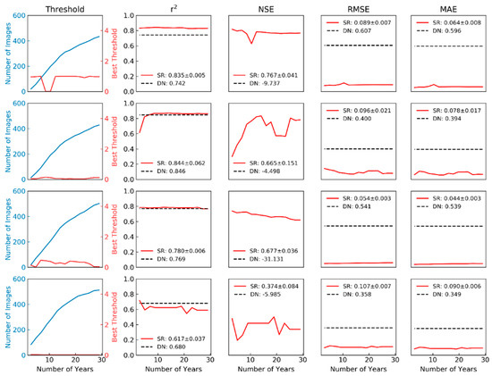 Effect of the length of Landsat time series on the identification of NIR thresholds and the quality of the NDVI correction. Plots in rows 1-4 show the effects at sites 1-4 respectively. Columns 1-5 show responses of the number of images, coefficient of determination, Nash–Sutcliffe efficiency, root mean square error, and mean absolute error, respectively.