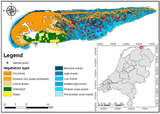 Vegetation map of Schiermonnikoog island and location of visited sample plots.