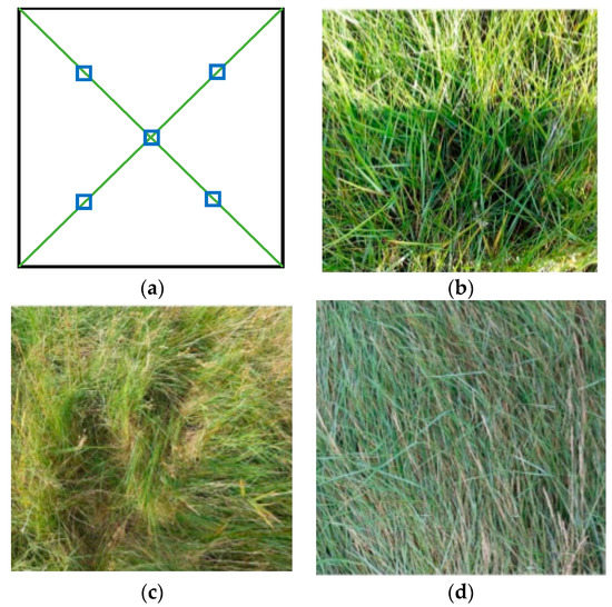 Schematic diagram of the subplots within a plot (a), and three of the dominant grass species in the test site: Elytriagia atherica (b), Festuca rubra (c), and Puccinellia maritima (d).