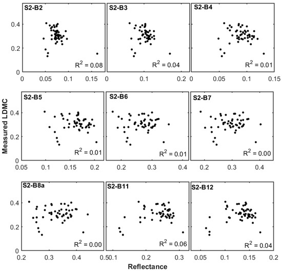 To assess the response of Sentinel-2 reflectance to LDMC variation, the relationship between reflectance in the different bands of Sentinel-2 and the field measured LDMC was investigated before the calibration of vegetation indices. As shown in Figure 3, many of the Sentinel-2 bands’ reflectance did not show a statistically significant correlation to LDMC variation. Band 2 (560 nm) and Band 11 (1614 nm) were the only bands that showed a significant but weak (R2 = 0. 08 and R2 = 0.06 respectively) correlation (p < 0.05).
