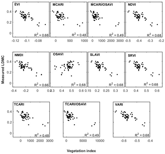 The results of the correlational analysis between the optimized VIs and measured LDMC are illustrated in Figure 5. As expected, the optimization tremendously improved the correlation between the VIs and measured LDMC. All vegetation indices showed a statistically significant linear correlation (Table 3) to LDMC (p < 0.05). The relatively lower correlation was observed for the two vegetation indices, modified chlorophyll absorption in reflectance index (MCARI) and transformed chlorophyll absorption in reflectance Index (TCARI) (R2 = 0.48).