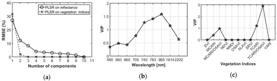 PLSR number of components against root mean square error (RMSE (%)) of predictors (a). Variables importance in the projections (VIPs) with spectral reflectance of Sentinel-2 bands (b), and vegetation indices (c) used as predictors.