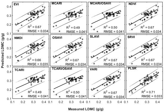 Measured vs. predicted LDMC derived from all selected vegetation indices, as well as partial least square regression (PLSR). The dark solid lines show the relationship between measured and predicted LDMC; the sets of two grey lines show the standard deviations of error regarding the prediction.
