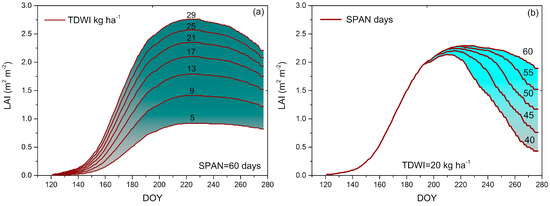 Evolution of the simulated LAI profiles produced by the WOFOST model (a) LAI versus TDWI (b) LAI versus the life span of leaves growing at 35 °C (SPAN).