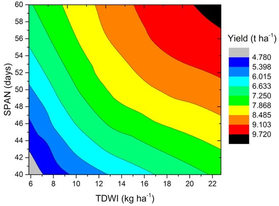 Previous studies have indicated that TDWI and SPAN parameters show significant uncertainty in regional applications of crop models. After optimizing these two parameters by the assimilation method, the prediction accuracy of crop yield was significantly improved [9,60]. In particular, TDWI of perennial jujube trees was strongly influenced by tree age and planting density, showing uncertainty in the same area [59]. The trends in the impact of TDWI and SPAN on the jujube LAI produced by the WOFOST model were shown in Figure 3a,b. The initial growth rate and maximum leaf area index increased with the increase of TDWI, but the growth rate was gradually decreasing. SPAN determined the rate at which green leaves will turn brown, and therefore, affected leaf senescence rate and effective green leaf index in the late growing season [60]. In addition, SPAN explained to some extent the effects of nutritional stress, insect and disease factors on crop growth and yield [9]. Thus, TDWI and SPAN input parameters were selected and recalibrated by assimilating remotely sensed LAI. The simulated jujube yield was affected by the TDWI–SPAN joint distributions (Figure 4).