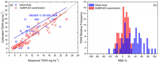 The 55 field-measured LAIs were assimilated into the WOFOST model to verify the performance of the reinitialized input parameters. For TDWI parameter, when the remotely sensed LAI was not assimilated, the average TDWI value of the same aged orchards was input to the WOFOST model. Scatter plots for re-calibrated TDWIs based on SUBPLEX assimilation versus measured 55 TDWIs are shown in Figure 8a, with an R2 of 0.86. After SUBPLEX assimilation, the accuracy of the corrected TDWI with an RMSE of 1.88 kg ha−1 was significantly higher than that of the unassimilated LAI (RMSE = 5.09 kg ha−1), and the calibrated average TDWI value of 13.91 kg ha−1 showed an error of 3.3% compared with field-measured average value of 13.46 kg ha−1. The samples with a prediction error between −10% and 10%, −20% and 20% accounted for 41.6% and 83.6%, respectively (Figure 8b). These values showed better performance for TDWI calibration than open-loop simulation with 21.8%, 36.4%, and 49% of −10–10%, −20–20% and −40–40%, respectively. RBE values after SUBPLEX assimilation were distributed more centrally around zero compared with the values with open-loop simulation. For SPAN parameter, validating its spatial distribution was difficult due to a lack of corresponding measured data for 55 samples. However, the average value after assimiltion with 49.95 days showed an error of 5.8% compared with the field experimental mean value of 53 days. The results also suggested that SUBPLEX assimilation reduced the uncertainty of TDWI and SPAN input parameters to some extent.