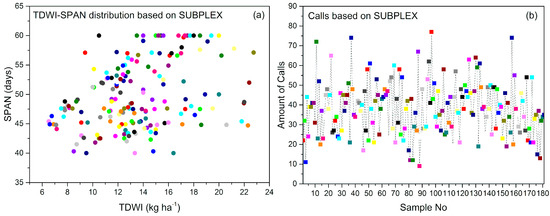 After carrying out SUBPLEX assimilation, the joint distribution of TDWI and SPAN was generated for 181 samples to provide variability in parameter distribution between different samples (Figure 9a). Explaining the shape of the distribution was difficult because they were the result of many interaction factors [60], such as meteorological conditions, pests and diseases, and nutritional stress. However, TDWI values recalibrated by SUBPLEX assimilation ranged from 5.84 to 22.75 kg ha−1, showing high variability between orchards. Assimilating remotely sensed LAI achieved good TDWI correction for 181 samples, with an average value of 13.46 kg ha−1 compared with the field-measured mean value of 13.45 kg ha−1 (55 samples). SPAN values ranged from 40 to 60 days with an average of 49.73 days, which showed an error of 6.2% versus the measured mean value at the field experiments with 53 days. Figure 9b shows that the SUBPLEX algorithm used fewer function calls (iteration times) to complete data assimilation, ranging from 9 to 77 with an average of 40, at relative tolerance ε = 0.05. The low number of iterations also indicates that the SUBPLEX algorithm showed a relatively high computational efficiency to some extent.