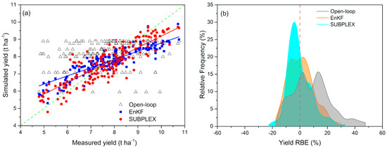 The scatter plots of the simulated yields achieved from the unassimilated, EnKF, and SUBPLEX assimilations versus actual yields are shown in Figure 10a. The WOFOST-estimated yield with open-loop simulation exhibited a poor spatial distribution and prediction performance, clearly deviating from the line y = x and 71.8% of the samples were severely overestimated. Both EnKF and SUBPLEX assimilations significantly improved yield simulation performance with a scatter distribution closer to the line y = x. Although the dispersion of yield forecasts achieved by the SUBPLEX method was higher than that of ENKF, SUBPLEX showed better performance in high-yield and low-yield areas. Compared with the simulation without the assimilation and EnKF method, the SUBPLEX assimilation produced a relative bias error (RBE, %) that was more concentrated near zero (Figure 10b). The absolute RBE for yield simulation was lower than 10% in 80.1% and lower than 20% in 96.1% for SUBPLEX, 72.4% and 96.7% for EnKF.