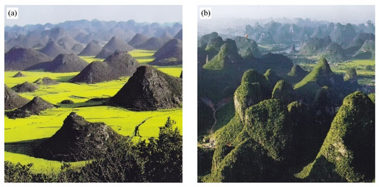 (a) Fenglin and (b) Fengcong landforms [24]. (Source: Chinese National Geography 612nd phase).