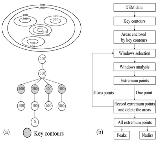 In this study, the size of the analysis window is set in accordance with the area surrounded by the key contours. The minimum key contour range is used as the size of the analysis window to search the extremum point. When only one extremum in the contour area is enclosed by each key contour line, the point is recorded, and the contour area is deleted. That is, each key contour corresponds to an analysis window of the same size, and only one extremum point can be found in such a window. Then, the analysis window for the remaining areas is expanded and operated in a loop until only one extremum point can be found in each key contour area. When the contour is located in a positive terrain, the maximum point is a peak. If the contour coil is located in a negative terrain, then the limit point is a nadir. The main workflow is shown in Figure 3b.