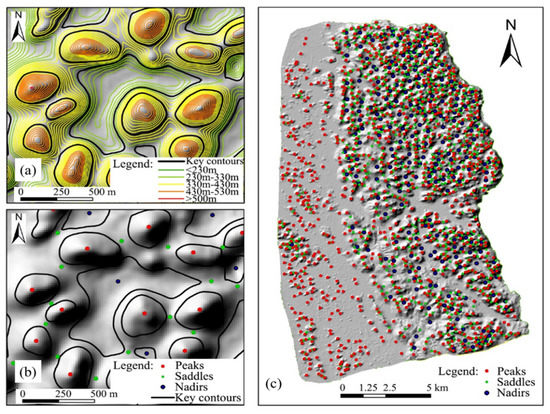 The contour lines are generated with a contour distance of 10 m from the 5 m resolution DEM data in the Guilin area. We establish the hierarchical structure of the contour lines and select the key contour lines (as shown in Figure 6a). The maximum point is the peak of the region, whereas the minimum point is the nadir point. Then, the saddles in this area are calculated by the changing rate of slope method (Figure 6b). A total of 1061 peaks, 958 saddles, and 252 nadirs are extracted in this area (Figure 6c).