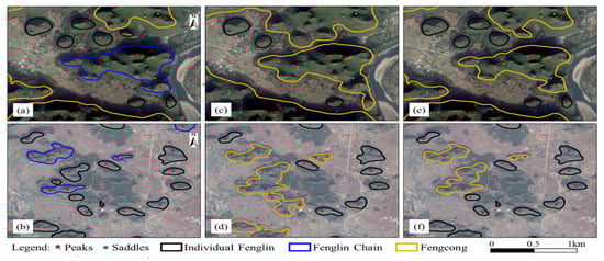 Comparison with existing methods: (a,b) results of feature point method; (c,d) results of Liang et al. [29]; (e,f) results of Meng et al. [24]. (a,c,e) In the Yangdi area of Guilin, Fenglin chains surrounded by Fengcong. (b,d,f) In the Dabu area of Guilin, Fenglin chains surrounded by individual Fenglin.