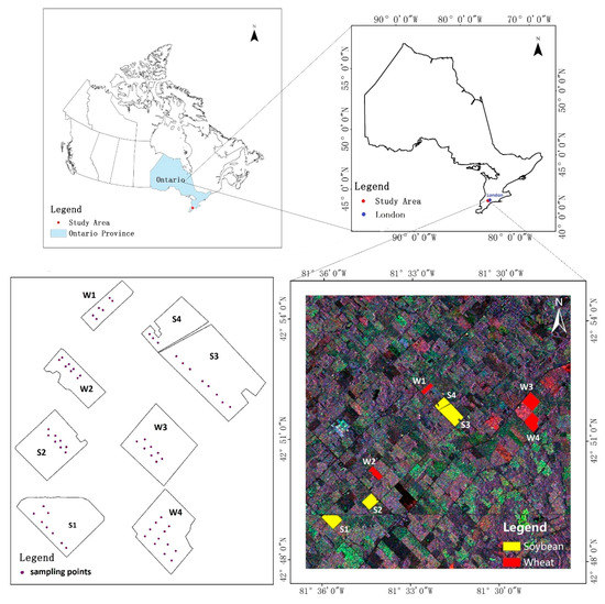 The study area is located in southwest Ontario near London, Canada (Figure 1). It is an agriculturally productive area in Ontario. The dominant crops are winter wheat, corn, and soybean [41]. There are also some alfalfa and hay growing in this area [42]. Winter wheat is usually sown in October of the previous year and harvested in late July to early August the following year; whereas, corn and soybean are usually sown in May and harvested in September or October. As the weather gets warmer in April, winter wheat starts to grow. Therefore, field campaign was conducted in the study area from April to October in 2015 simultaneously with each RADARSAT-2 SAR data acquisition. In addition, the study sites were not irrigated over the entire crop growth stages. It is important to note that vegetation coverage was variable throughout the crop growing season. The vegetation cover was fully open or low at the beginning of the season and it became denser as the crops continued to develop. Figure 2 and Figure 3 show sample ground truth photos of soybean and winter wheat.