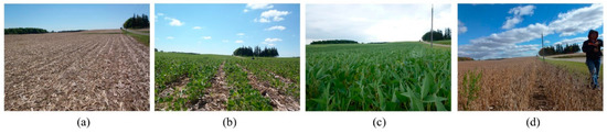 Ground truth photos of soybean. (a) 9 June. (b) 17 July. (c) 13 September. (d) 14 October 2015.