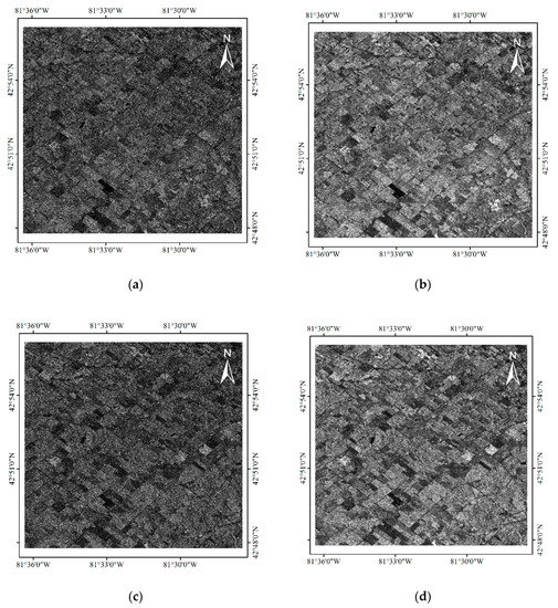 (a) The original Synthetic Aperture Radar (SAR) images at HH polarization acquired on 17 July 2015. (b) Filtered SAR image at HH polarization. (c) The original SAR image at VV polarization acquired on 17 July 2015. (d) Filtered SAR image at VV polarization. (RADARSAT-2 Data and Products © MacDonald, Dettwiler and Associates Ltd (2015)—All Rights Reserved. RADARSAT is an official trademark of the Canadian Space Agency).