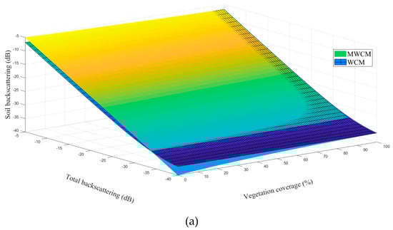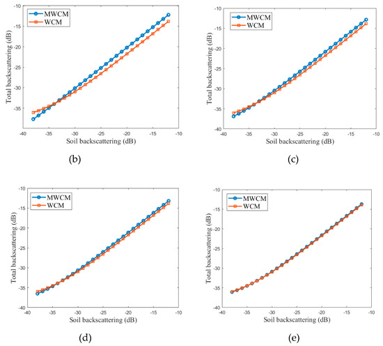 To compare the MWCM and WCM under different vegetation coverage, the behaviors of MWCM and WCM were studied as a function of vegetation coverage and PAI in HH polarization. The PAI in both models was estimated while using vegetation coverage (See Equation (12)). Figure 6a–e depicts the behaviors of backscattering as a function of vegetation coverage using the WCM and MWCM, respectively. The figure clearly shows that the radar signal is sensitive to vegetation coverage in both MWCM and WCM. The simulated soil backscattering coefficients using WCM and MWCM are nearly the same when vegetation coverage is greater than 90% (Figure 6e). They are similar to each other when vegetation coverage is between 60% and 90% (Figure 6d,e). They diverge from each other when the vegetation coverage is less than 60% (Figure 6b,c). When the total backscattering coefficient is greater than −33 dB, the soil backscattering coefficient that is simulated by MWCM more significantly decreases than that simulated by WCM with the increase of vegetation coverage. When the total backscattering coefficient is less than -33 dB, the backscattering coefficient that is simulated by MWCM is less than that simulated by WCM. Note that, in the case of bare soil, when the vegetation coverage is 0%, the total backscattering coefficient and the soil backscattering coefficient simulated by MWCM is equal to each other (Figure 6a). However, in the case of bare soil, the soil backscattering coefficient that is simulated by WCM is greater than the total backscattering coefficient. This indicates that MWCM is more sensitive to vegetation cover; therefore, it is a more suitable model under sparse vegetation cover conditions when compared with WCM.