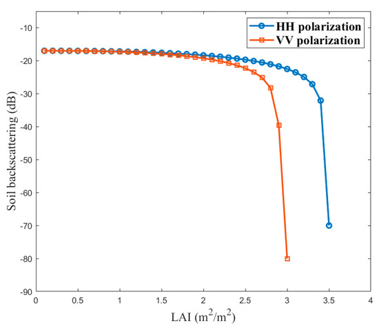 The soil backscattering was simulated using MWCM to quantify the performance of the proposed model under different PAI values (Figure 7). Figure 7 shows that soil backscattering decreases with an increase in PAI at both HH and VV polarizations. For HH polarization, soil backscattering exhibits a nearly vertical response once the PAI exceeds about 3.5 m2/m2. Soil backscattering at VV polarization has the same trend once the PAI exceeds about 3.0 m2/m2. It suggests that the SAR signal reaches saturation when the PAI is greater than 3.5 m2/m2 for HH polarization and 3.0 m2/m2 for VV polarization. It also suggests that HH polarization penetrates the vegetation canopy deeper than VV. The radar signal is unable to penetrate the vegetation, and the soil contribution can be negligible when the backscattering reaches saturation. Therefore, retrieval of SSM while using SAR data will become unreliable at high vegetation biomass.