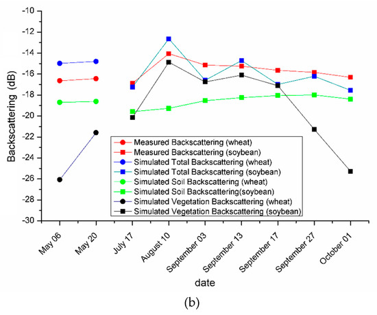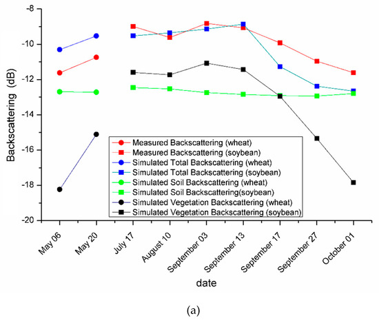 Figure 8 presents the time series backscattering modeling at both HH and VV polarizations using the MWCM. The soil backscattering is simulated from the Dubois model presented in Section 3.1. The vegetation backscattering is simulated using MWCM. Figure 8 shows that vegetation contributes to the total backscattering, and it will influence the retrieval of SSM. Vegetation backscattering varies throughout the crop growth cycle. The simulated total backscattering coefficient is overestimated at the early growth stage of wheat at both HH and VV polarizations (6 May and 20 May) (Figure 8a,b). The simulated total backscattering coefficient is underestimated at the late growth stage of soybean (from 17 September to 1 October) (Figure 8a,b). It may indicate that the retrieval of soil moisture is affected by crop growth stage.