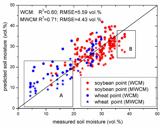 Half of the data points from field surveys were randomly selected and used to calibrate the MWCM. The remaining half of the dataset was used for model validation. Figure 9 shows the resultant inversion of SSM while using the WCM and MWCM to reduce the effect of vegetation. For WCM, the relationship between the measured and predicted SSM is linear (Figure 9) with a moderate correlation (R2 = 0.60, p < 0.01, RMSE = 5.59 vol.%). We observed that most of the estimated SSM was overestimated over the wheat fields, especially when the SSM is less than 20 vol.% (Rectangle A in Figure 9). This phenomenon mainly occurred at early growth stages of wheat (BBCH less than 30). The radar backscattering for crops is dominated by direct scattering from the soil in early stage, and the vegetation volume scattering is negligible. The soil contribution to the total backscattering is relatively strong at the early growth stages due to low vegetation coverage [60]. When vegetation is sparse at the early stage, the backscattering increase rate from vegetation exceeds the soil backscattering reduction, due to vegetation attenuation [61]. The backscattering contribution of bare soil must be considered as a primary component in the total backscattering due to the large vegetation gap. With the development of canopy, the backscattering contribution of soil gradually weakens and then reaches the minimum values at peak biomass. When vegetation is sparse, the vegetation gap information was not considered by WCM. Therefore, the SSM was overestimated by the WCM at the early growth stage.