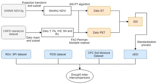 where x represents the EDI, y represents related drought indices, and n is the number of samples. The flowchart of procedure used in this study can be seen in Figure 2.