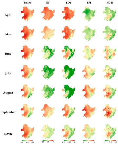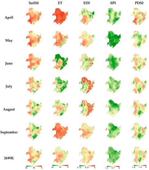 Monthly and seasonally composited (26-week) maps of normal conditions for the Soil Moisture (SoilM) (mm), evapotranspiration (ET) (mm/month), Evaporative Drought Index (EDI) (-), Standardized Precipitation Index (SPI) (-), and Palmer Drought Severity Index (PDSI) (-). Green indicates wetter conditions and red indicates drier conditions.