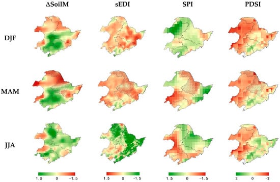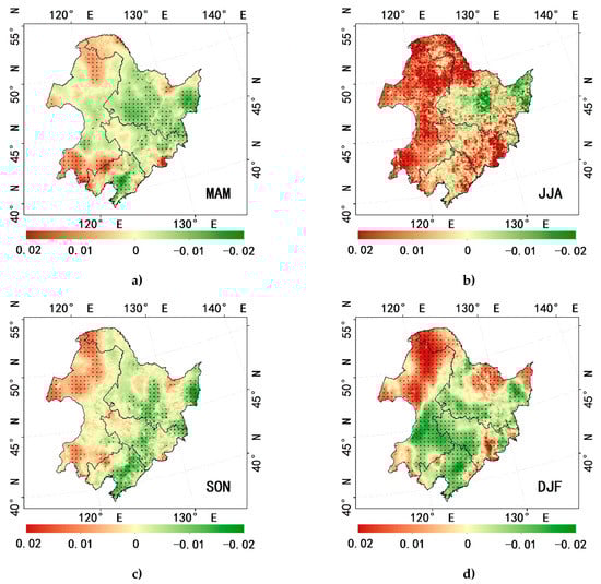 The seasonal trend of sEDI during 1982–2015 in Northeast China for (a) MAM; (b) JJA; (c) SON; (d) DJF. Green indicates wetter and red indicates dryer.