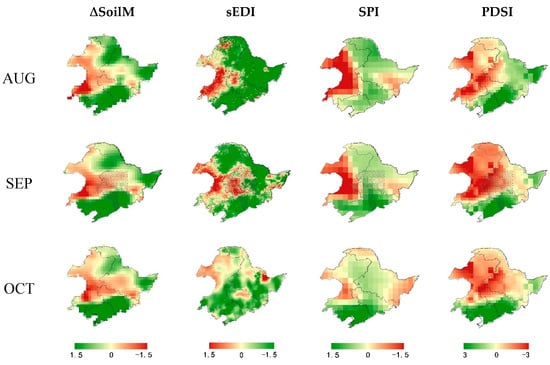 Monthly standardized anomalies in SoilM, EDI, SPI, and PDSI from August to October in 2010. Green indicates wetness and red indicates dryness. The dashed line refers approximately to a recorded dry patch.