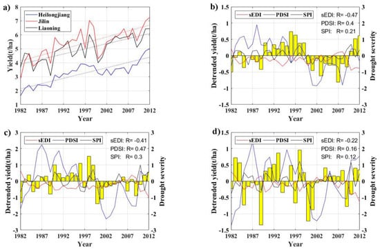 Agriculture is the major sector to be affected by drought, and the variability of major grain crops production can be used to evaluate the impacts of drought on agricultural ecosystems. As shown in Figure 9a, our results illustrate province-level grain crop yields show an upward trend in the period of 1982–2012 over Northeast China, which can be attributed to improved agronomic management, such as use of fertilizer, irrigation, and weed, pest, and disease control. To eliminate influences from these factors and identify a meaningful relationship between grain crop yields and drought indices, the detrended grain crop yield data and district-averaged drought indices including sEDI, PDSI, and SPI were generated for each province.